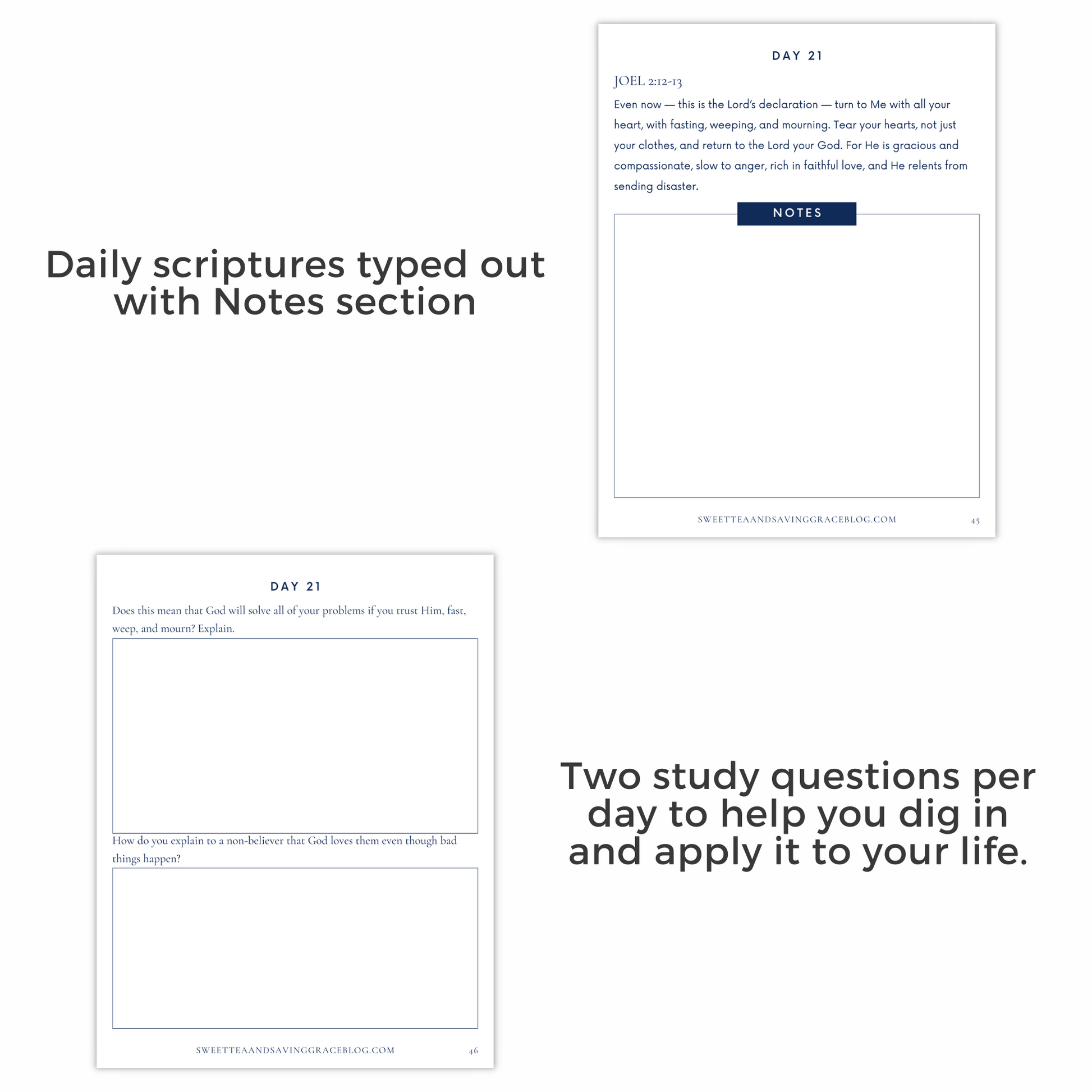 Each day in your workbook, you will see the daily scriptures typed out for you with a Notes section on the same page. This is space that allows you to highlight, circle, and mark the Bible verses based on how you like to study. You can use this space to add cross-references, define words or phrases, add Biblical or cultural context, or use the S.O.A.P. study method.