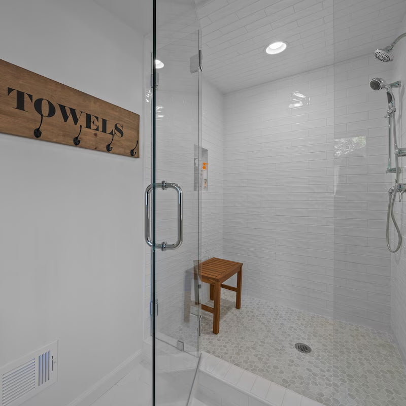 Twin XL rates include a shared room with up to 6 individuals. Each Twin XL bed has individual storage, individual charging stations, and individual dimmer lights. This room is adjacent to a sitting room with TV, and a full bathroom with a walk-in shower and double vanity.