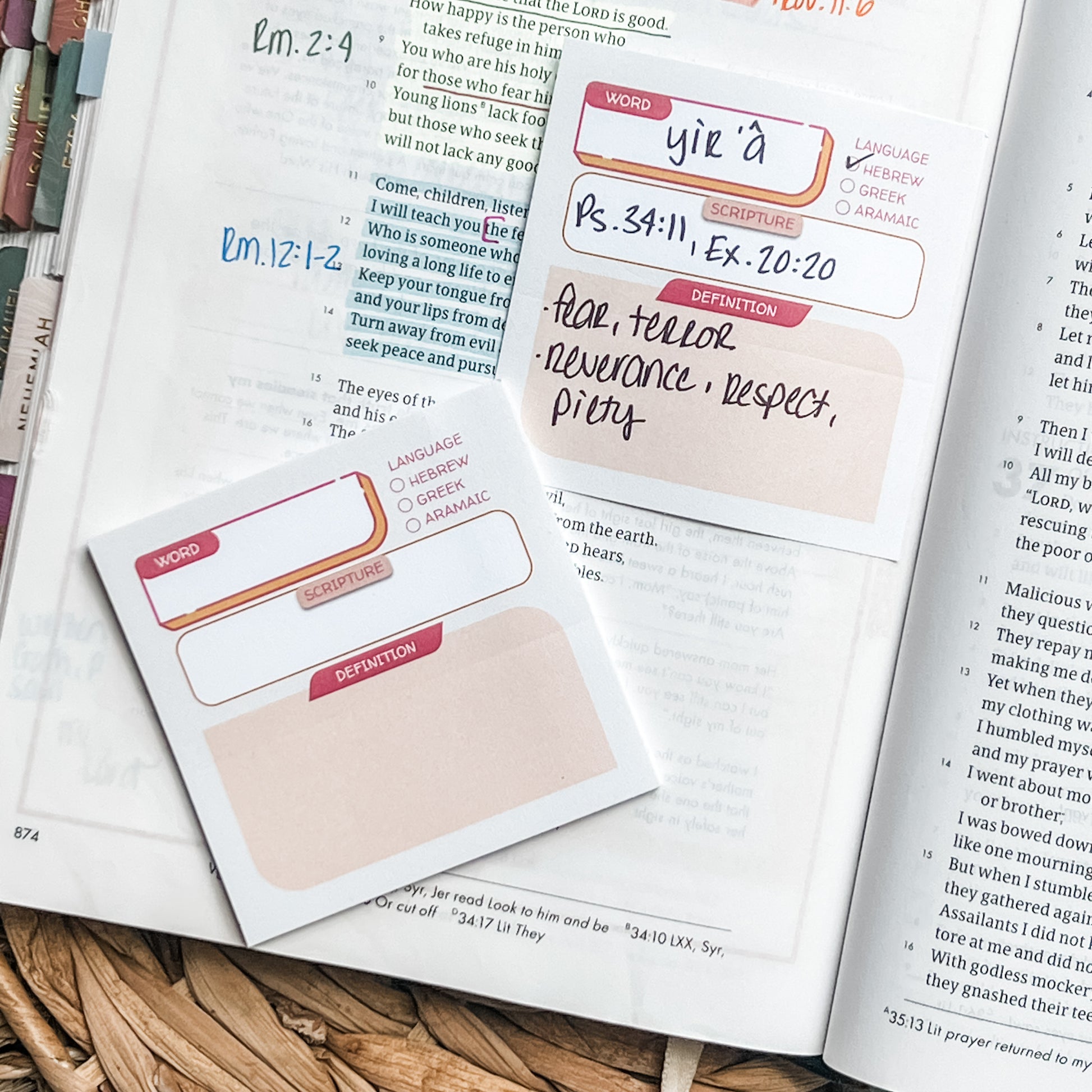 Set of 3 boho-colored sticky notepads perfect for adding tons of notes to the margins of your Bible! The set contains 2 general purpose sticky notepads with unlabeled boxes, and 1 word study notepad to help you dig into the original language of the Bible.