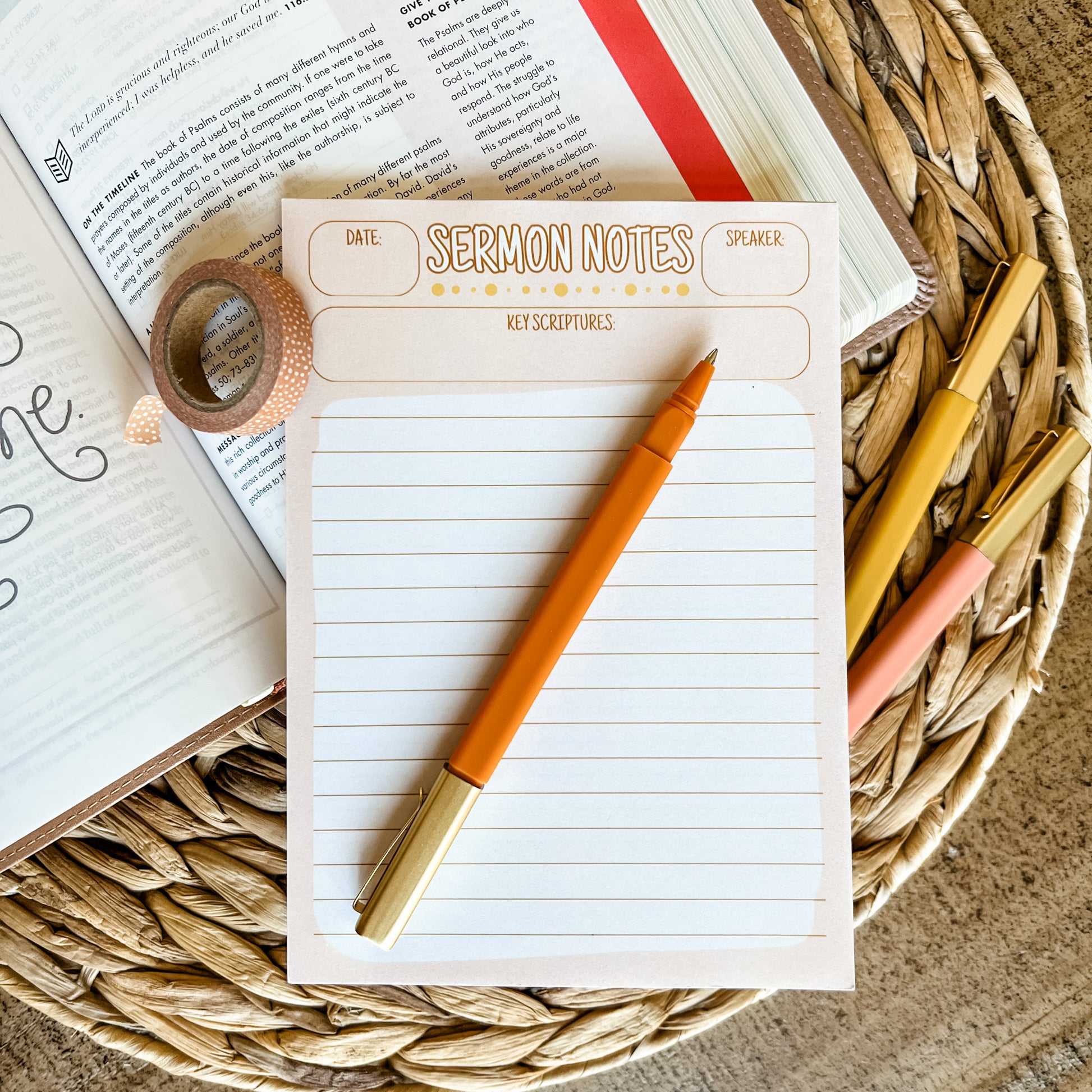 Take notes at church in boho style! The Boho Sermon Notes notepad is stylish and gives you plenty of space to take notes during church. Plus, they easily fit in your Bible for reference when you study!