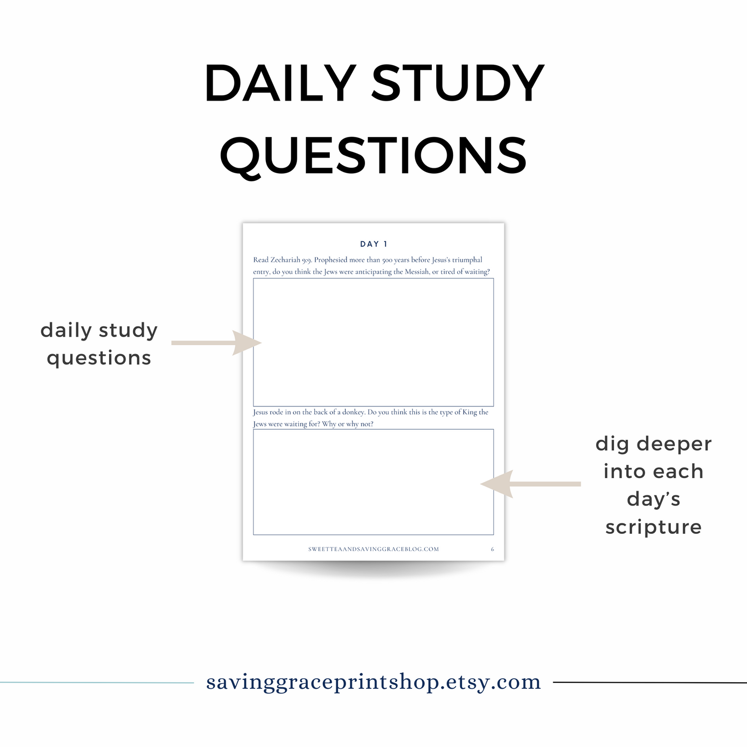 You will also have two questions each day that will encourage you to dig deeper into scripture and enhance your understanding of God’s Word. The end of the workbook contains two pages of Reflection questions to summarize the month-long study.