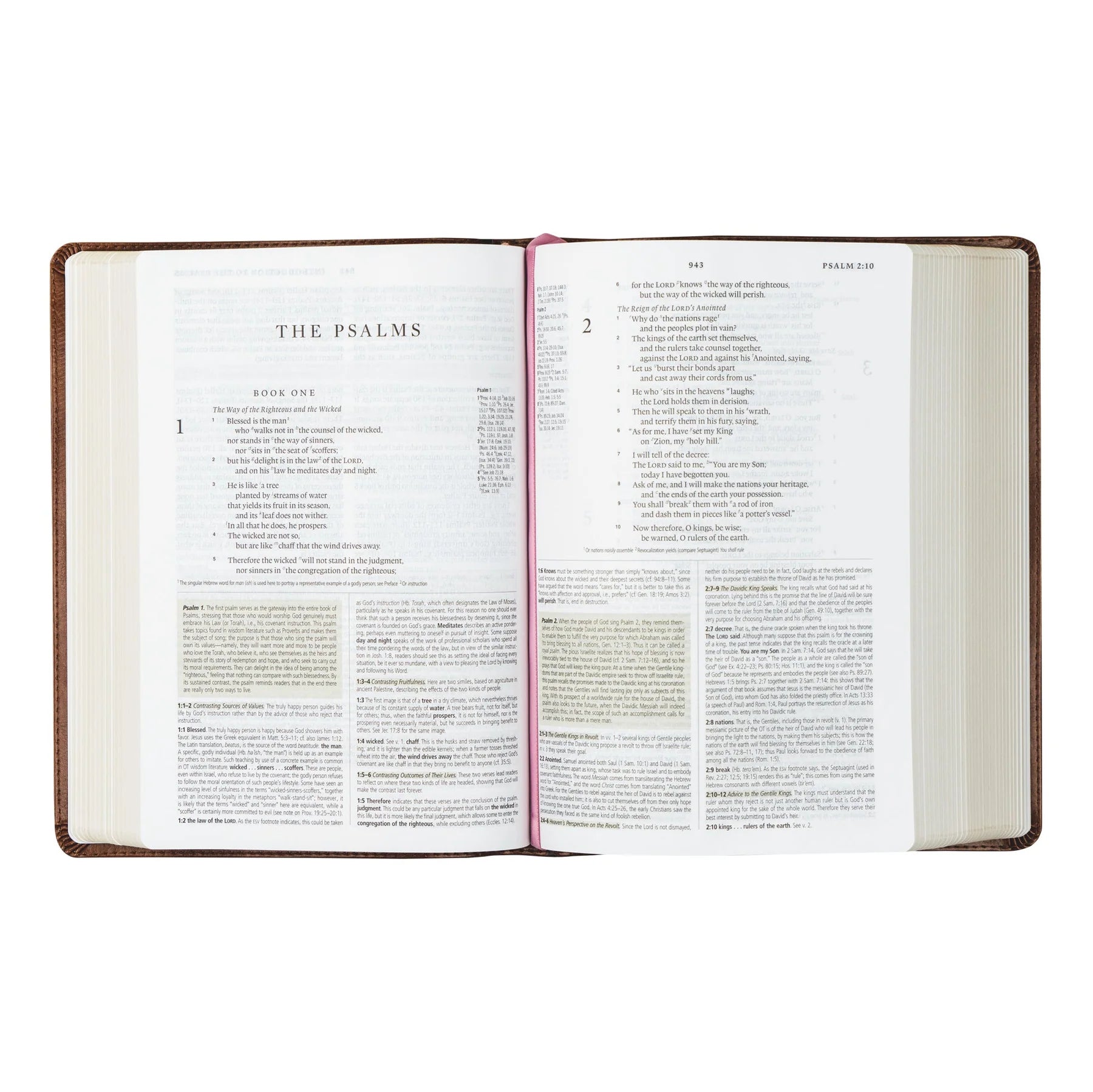 The inspiration for this beautiful leather-like Bible comes from the beautiful city of Aurora, Colorado, nicknamed “The Gateway to the Rockies.” Aurora is surrounded by large meadows filled with gorgeous flowers with the Rocky Mountains looming large in the background. The front cover of our very first leather-like ESV Study Bible features pressed floral artwork, and the back cover displays Joshua 1:8, which says, “This book of the law shall not depart from your mouth, but you shall meditate on it day and night.”