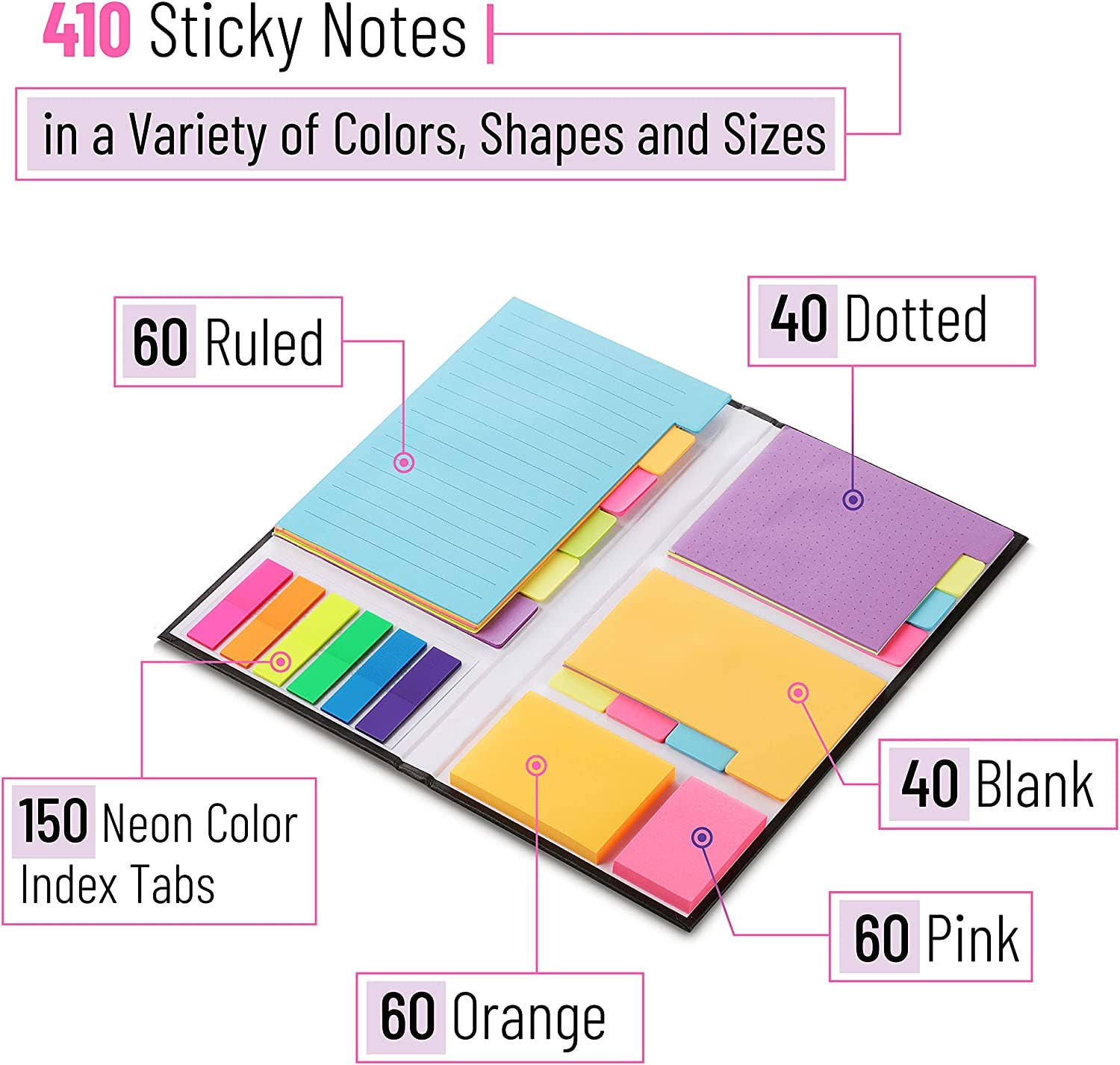 Each sticky notes set includes 410 Total Tab Divider Notes High Quality And Thick Paper (20lb):