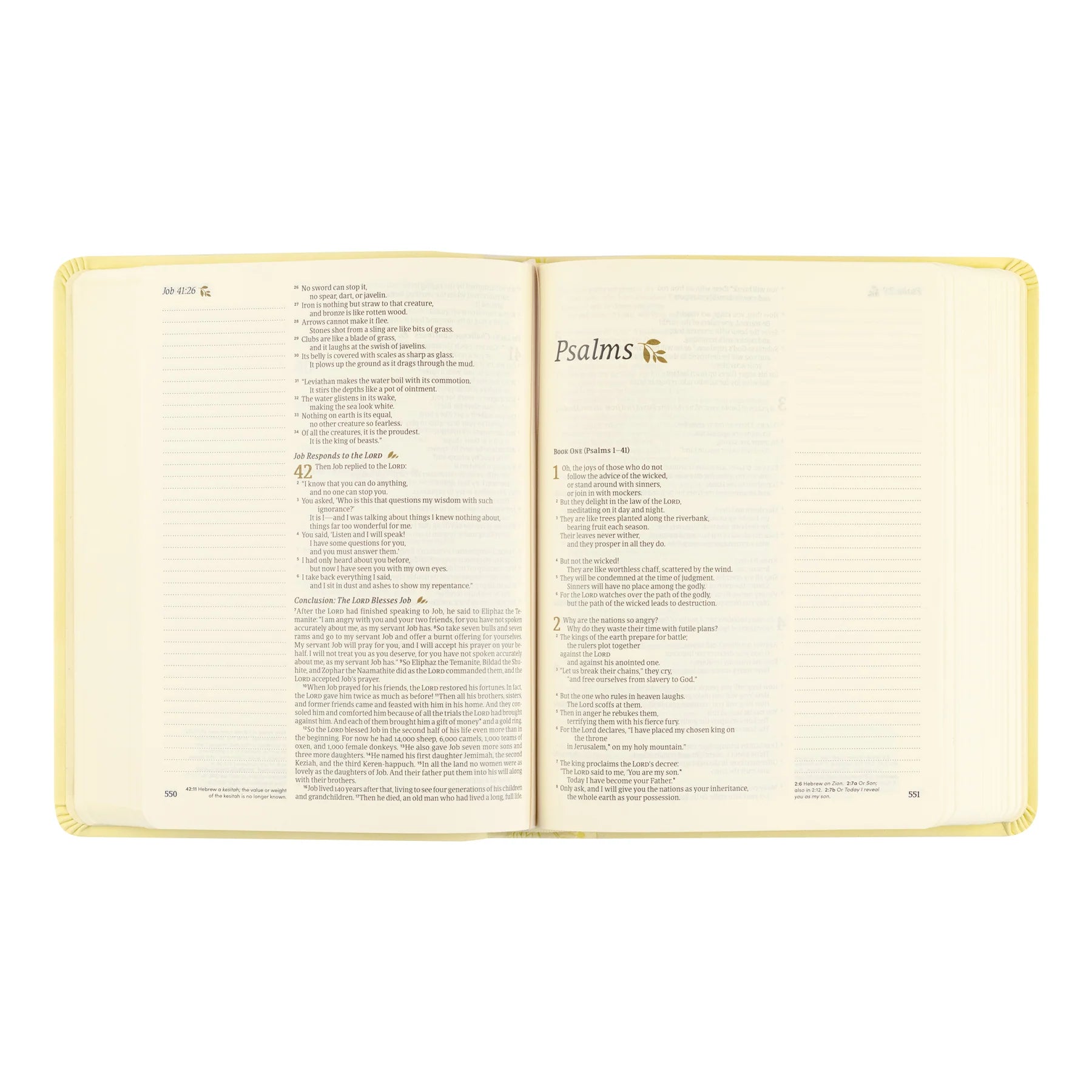 Hosanna Revival's Belfast Bible’s delicate, soft yellow color features an embossed daffodil. After a long winter, the daffodil is the first to make its return in the Spring. These flowers can endure harsh conditions, symbolizing a pure and gentle resilience, one we ourselves can receive through Christ’s strength within us. Through his power within us, we are able to endure, relying on his strength alone. The back of this Bible features Psalm 40:16: “May all who search for you be filled with joy and gladness in you,” a prayer that reminds us of the joy that comes when we seek the Lord, discovering his Word and learning more of his beautiful character. We pray that this Bible would remind you daily that he is a good father worthy of your full affection and devotion.
