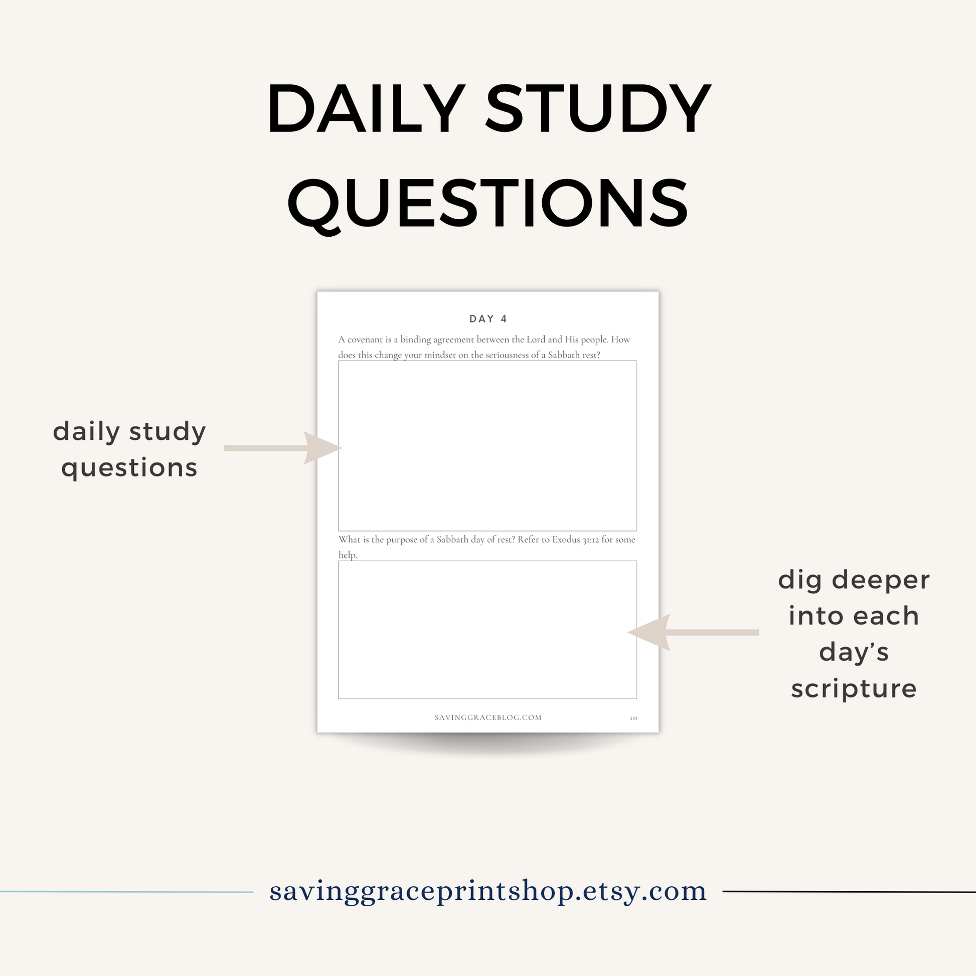 The Sabbath: 30-Day Bible Reading Plan + Workbook is a 69-page PDF available for immediate download that includes daily reading assignments and questions, as well as Reflection questions at the end of the workbook. **NO PHYSICAL PRODUCT WILL BE SENT.