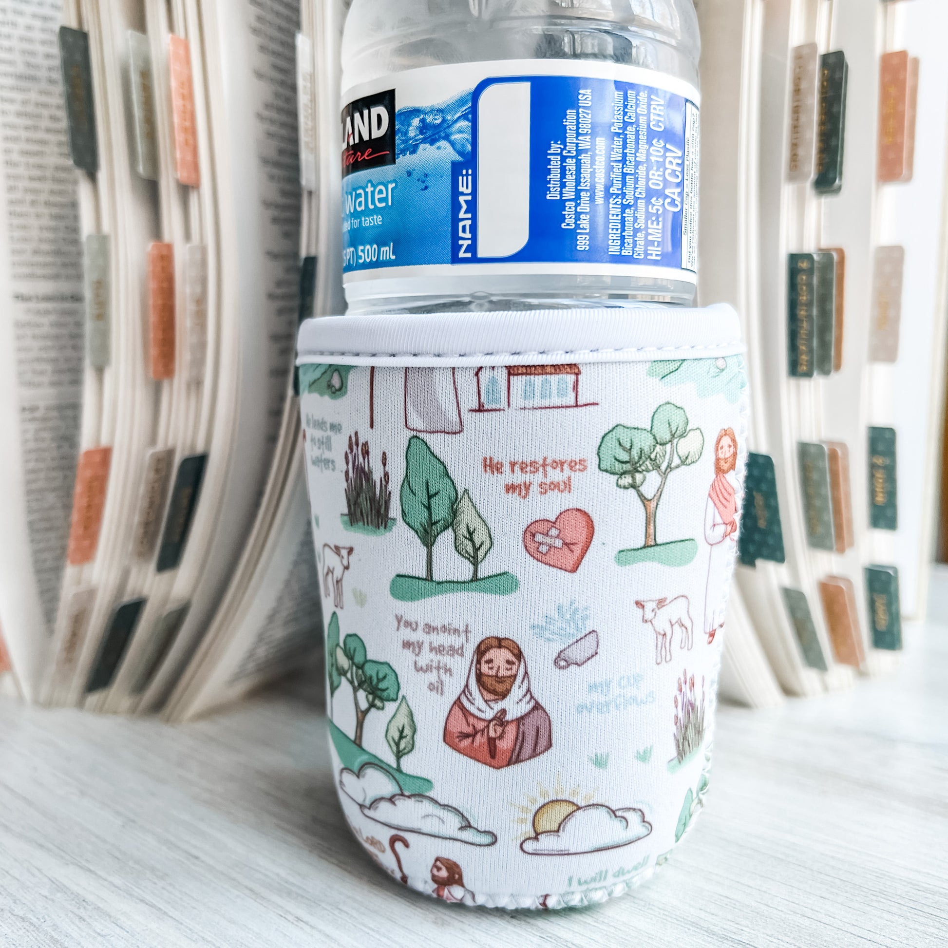 The cutest little coffee sleeve features The Good Shepherd with lambs and trees and various verses from Psalm 23.